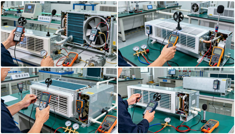 答:風量罩測風量→進出水溫差計算冷量→噪聲頻譜分析→電氣安全測試→凝露控制驗證。